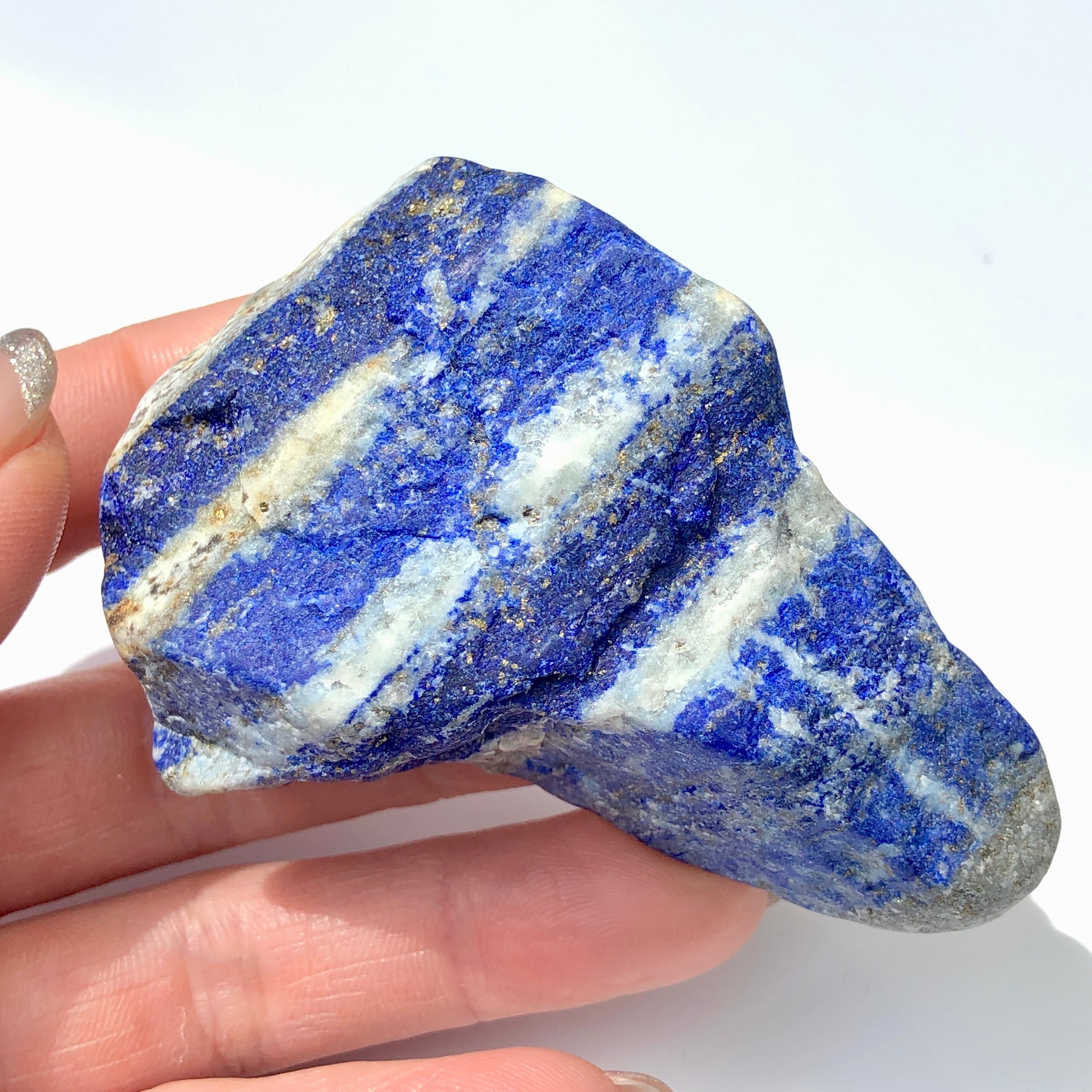 ラピスラズリの青色と石英の白色が美しいコントラストを描き、金色のパイライトや、銀色に輝くマイカ(雲母)が混ざるものもあります。