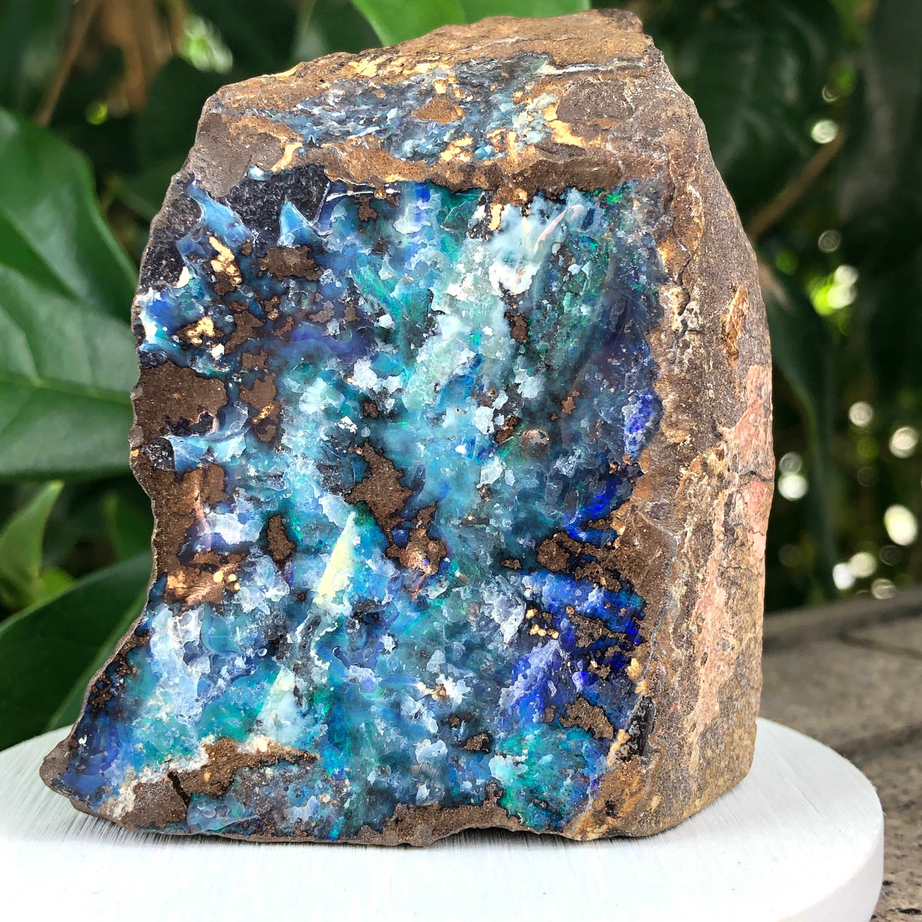 ブルー系の遊色効果が美しい、ボルダーオパール母岩付き原石が新入荷。