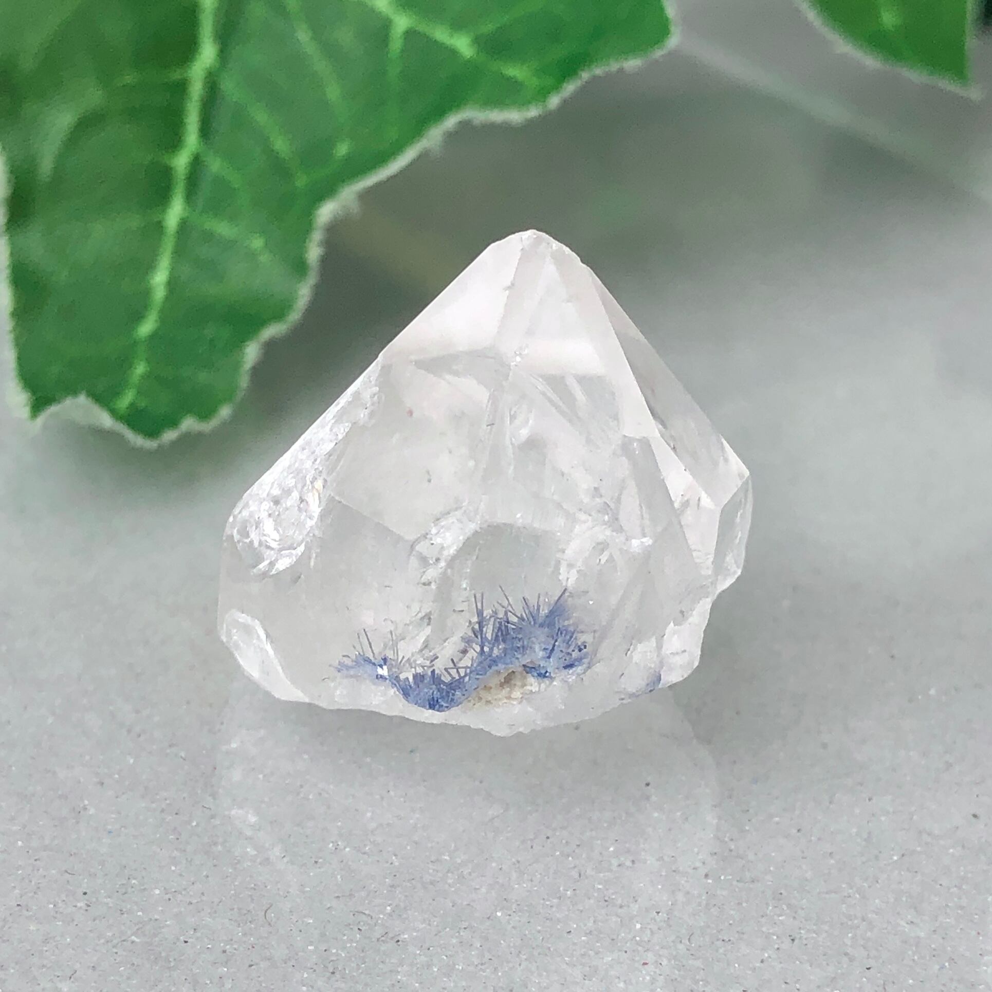 水晶に内包された独特の青い結晶が美しい、デュモルチェライトインクォーツ。