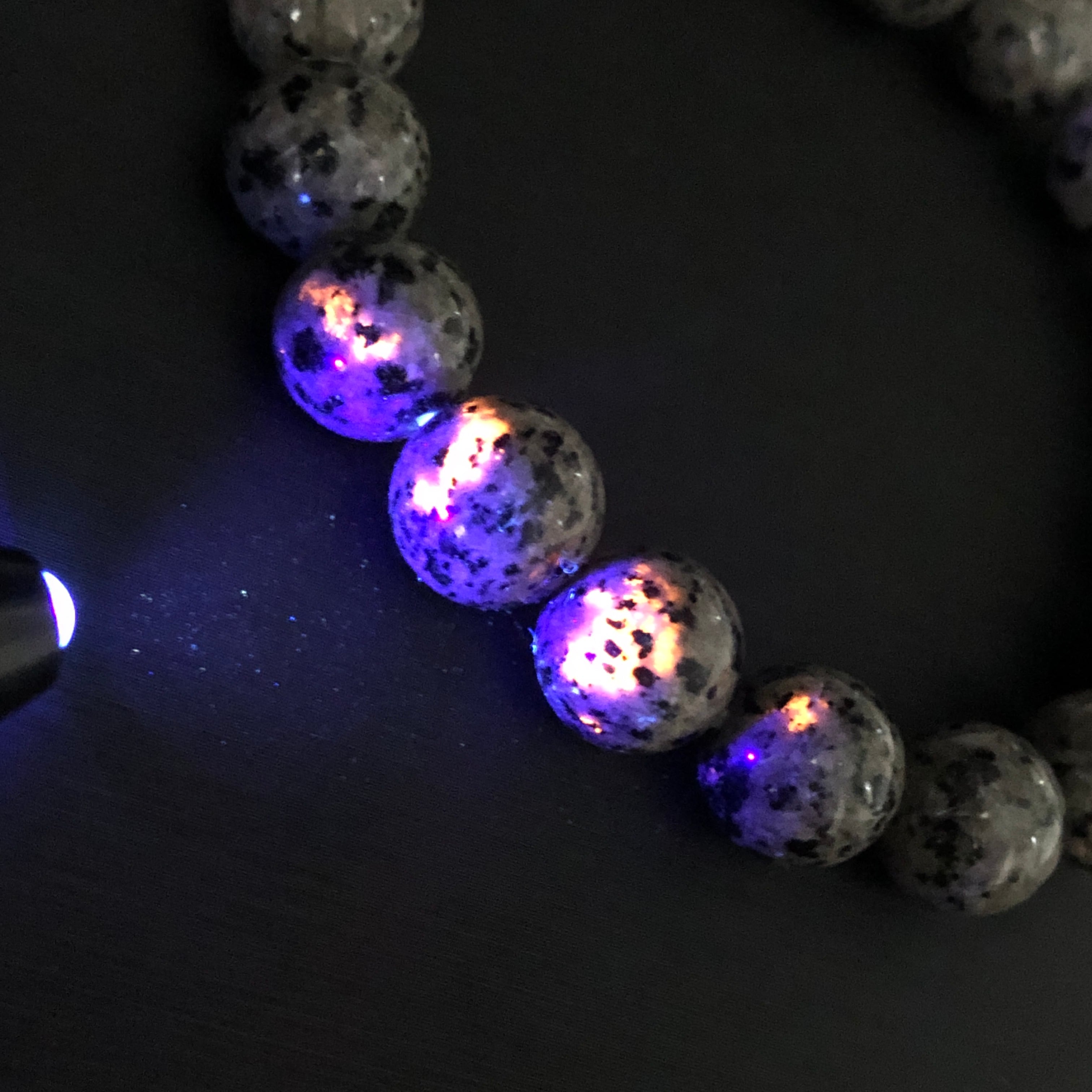 紫外線(ブラックライト)で色を変えるカラーチェンジストーンで、その変色性からコレクターズストーンとしても非常に人気の高い天然石です。