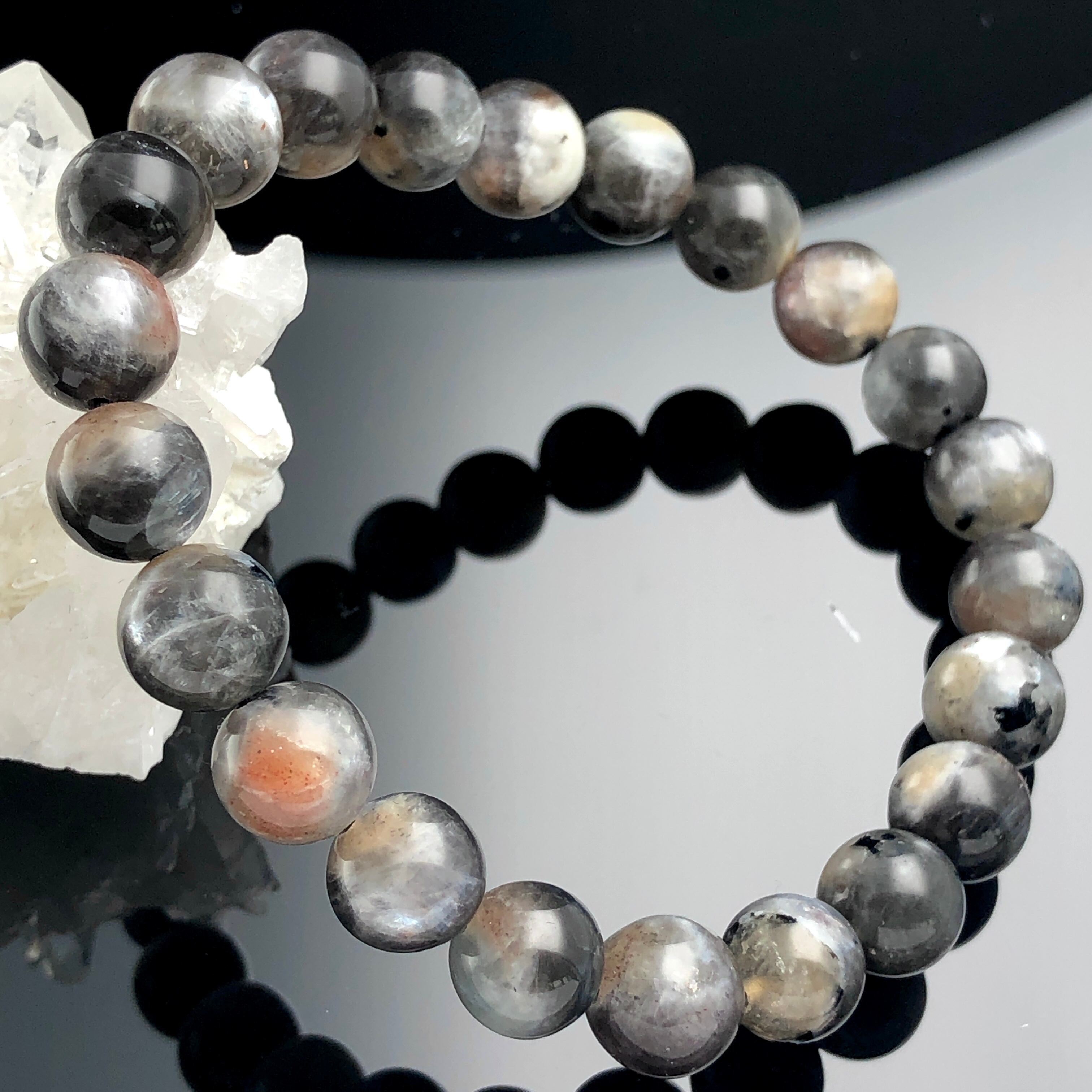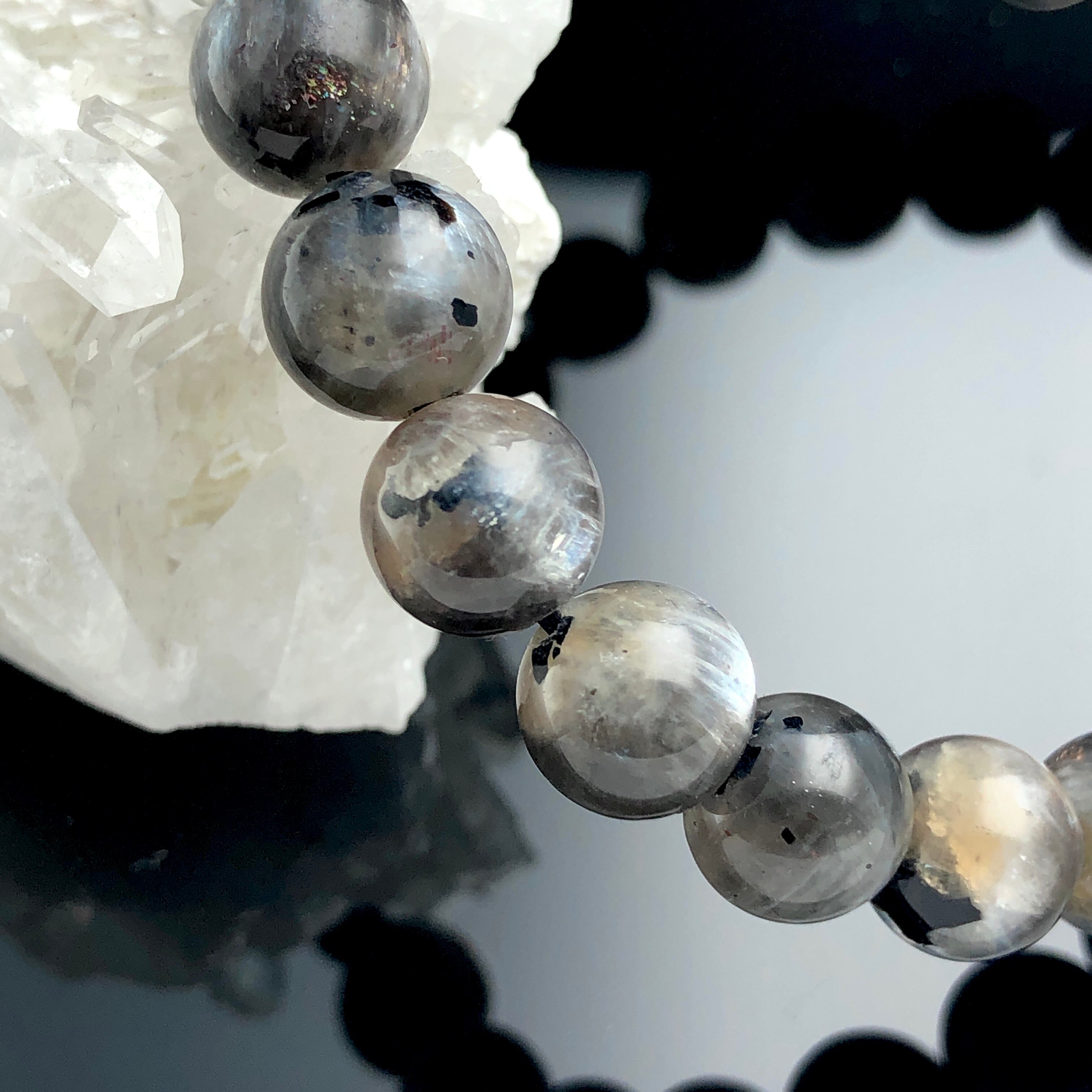 ホワイト、シルバー、ブルーのシラーを中心に、サンストーンのようなオレンジ系のアベンチュレッセンスが見られる粒もある、神秘的なパワーストーンです。