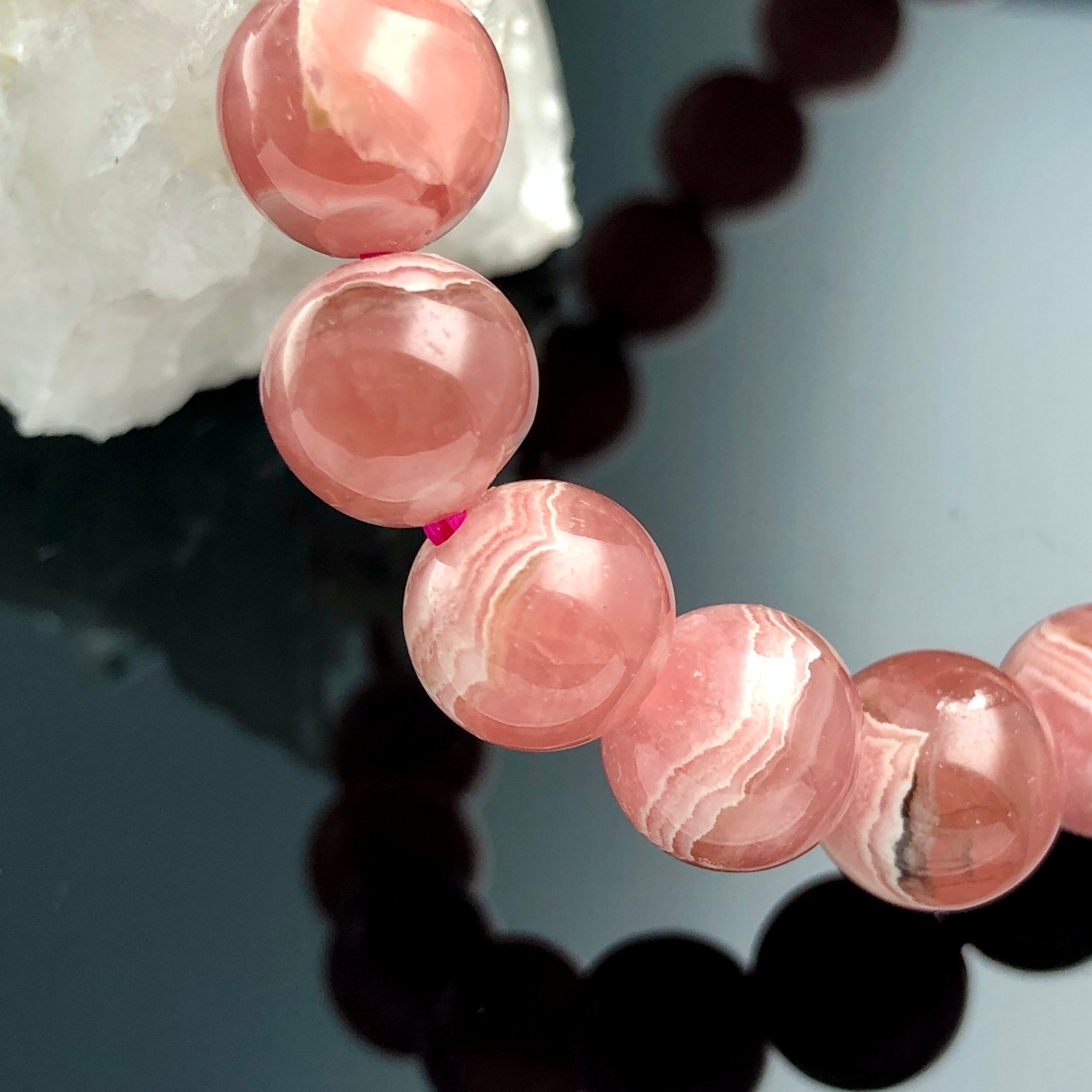 発色のよい、鮮やかなピンクレッドカラーのインカローズ(ロードクロサイト)ブレスレット。