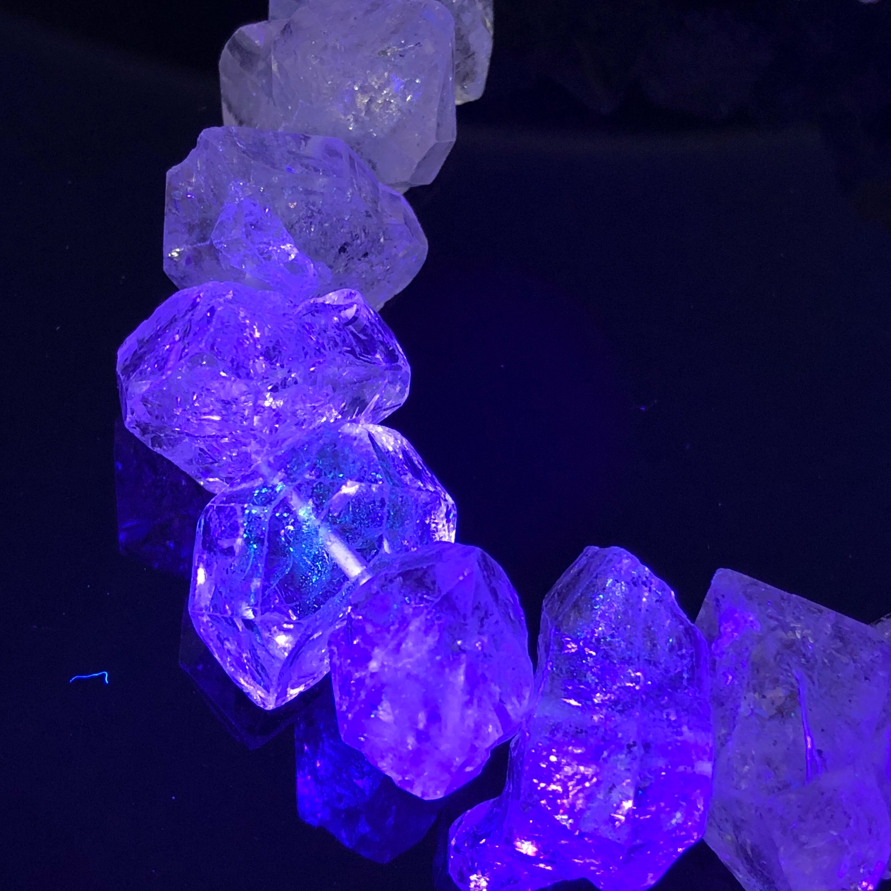 ブラックライトで、含有されたオイルが蛍光色を放つ不思議なブレスレットです。
