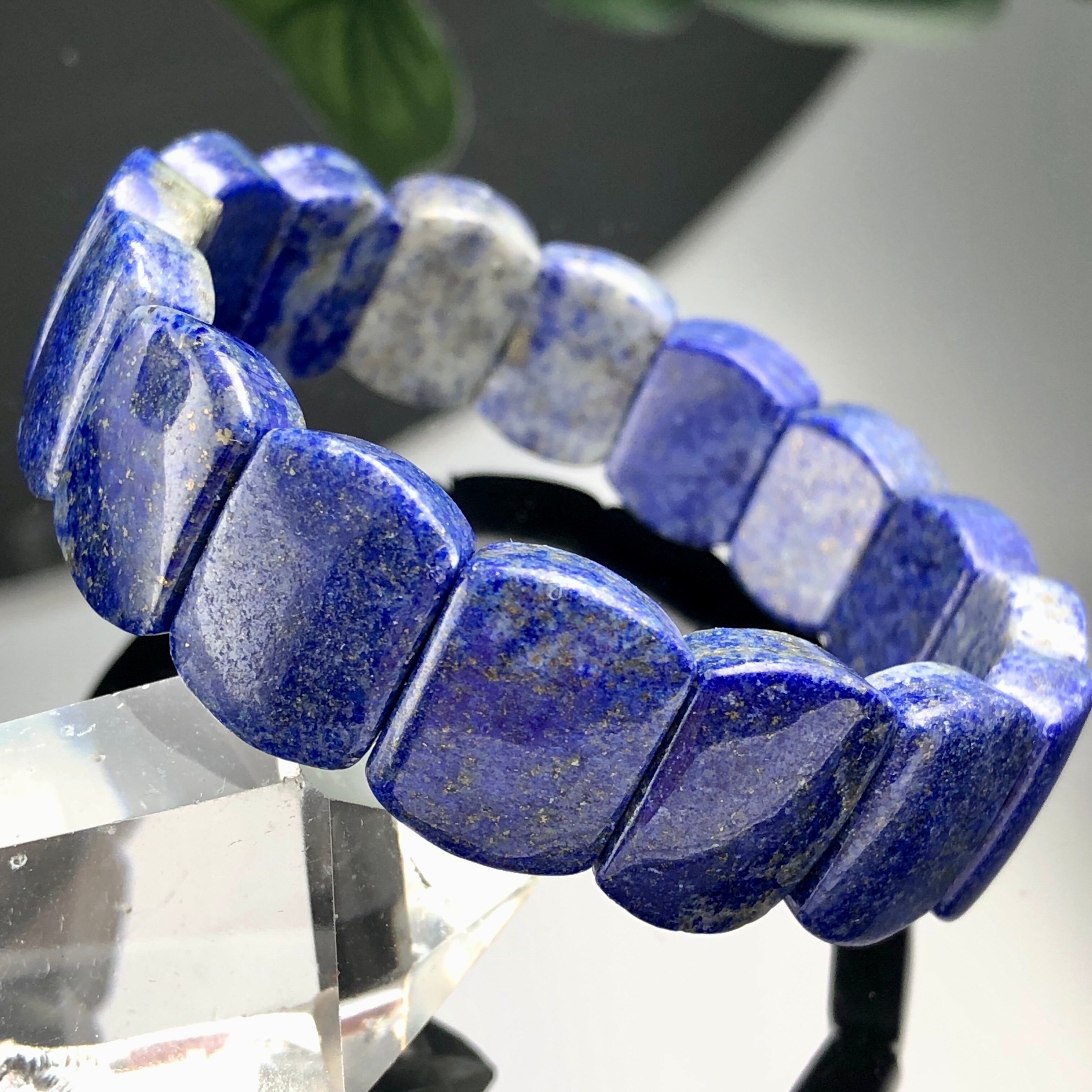 ラピスラズリの青色と石英の白色が美しいコントラストを描き、金色のパイライトが存在感を放っている人気のパワーストーンです。