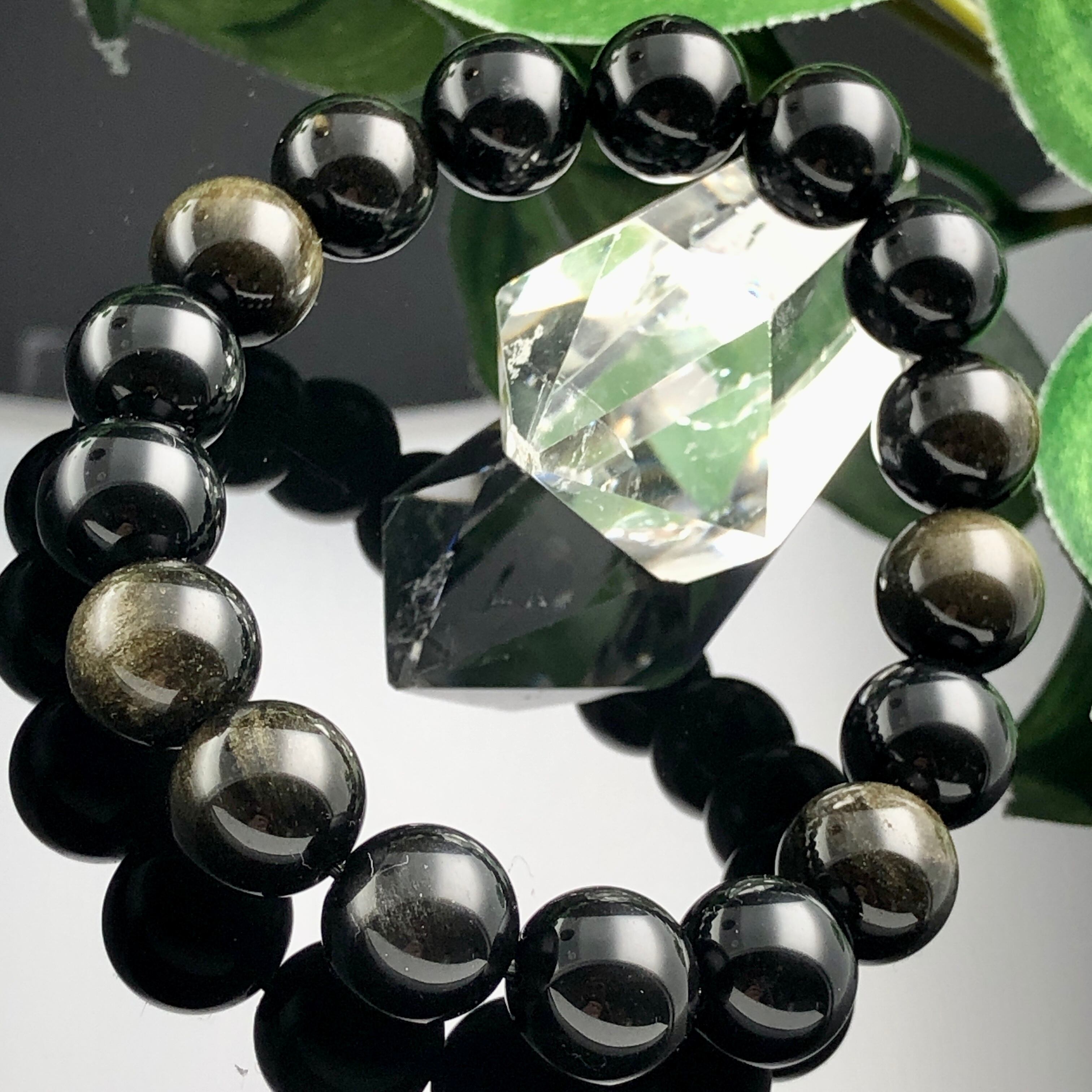 ブラックオブシディアン(黒曜石)の中に、キラリとゴールドの輝きが光るパワーストーン。