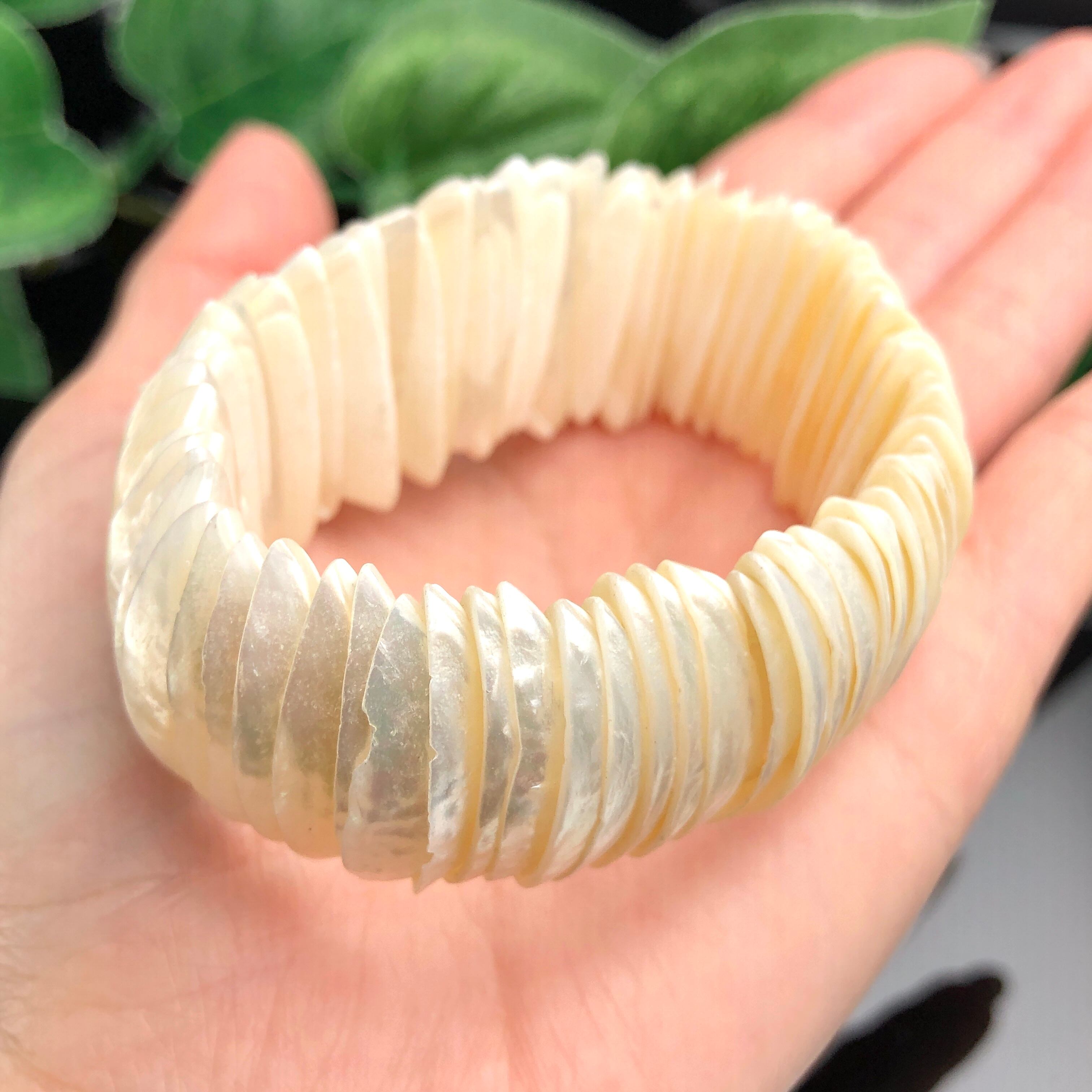 淡い優しい色あいのホワイトシェルバングルブレスレット。
