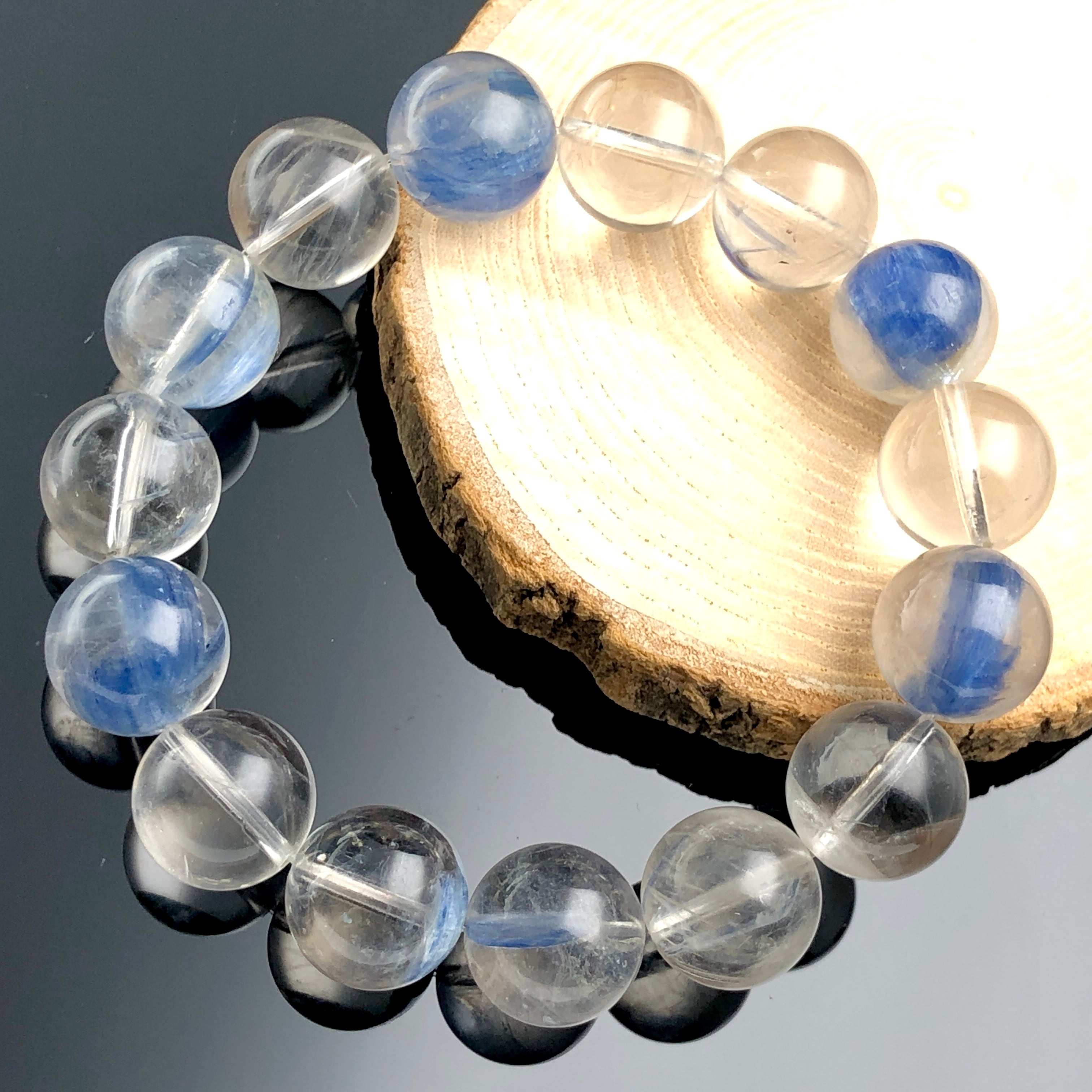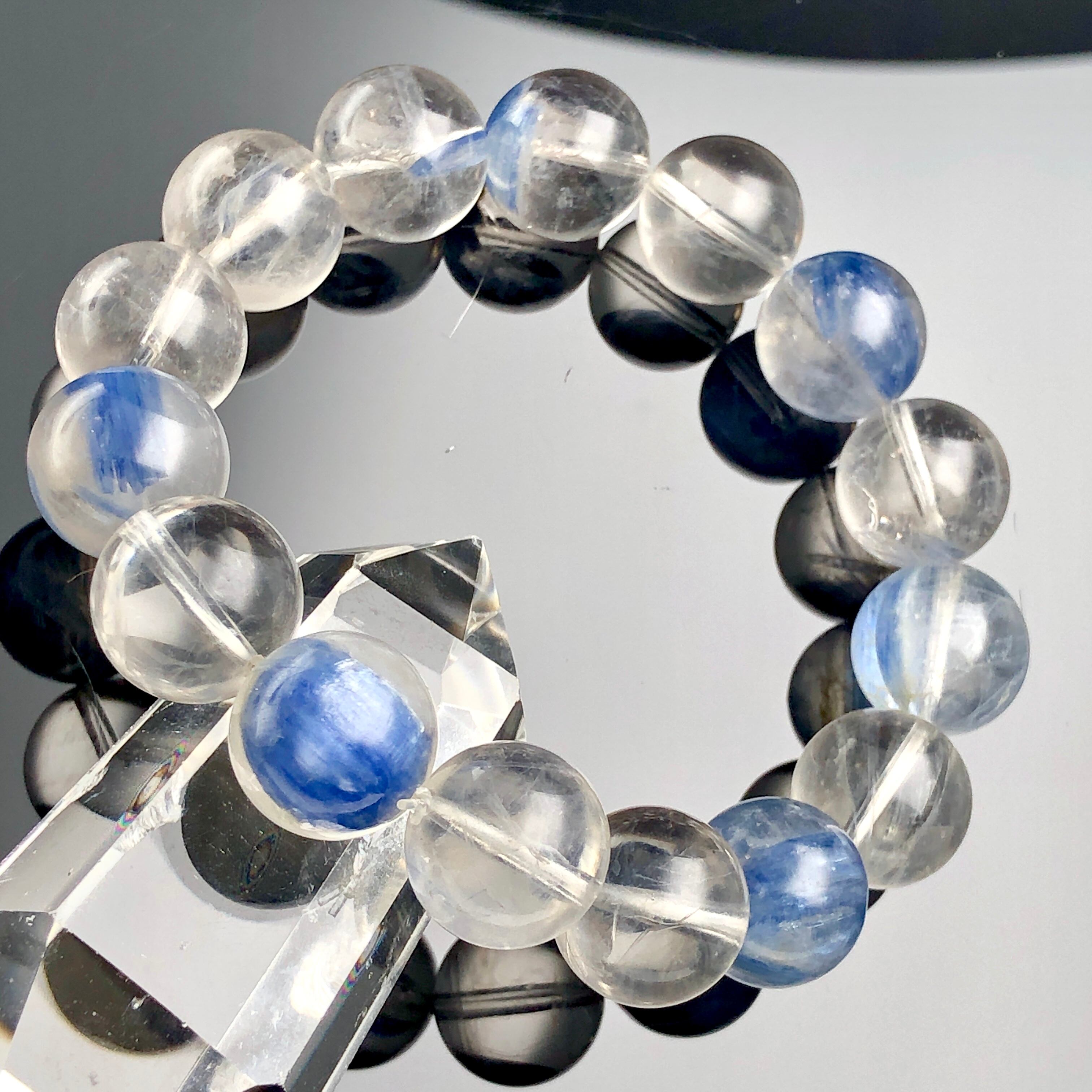 艶と透明感のある水晶をベースに、カイヤナイト特有の結晶が美しく見られるブレスレットです。